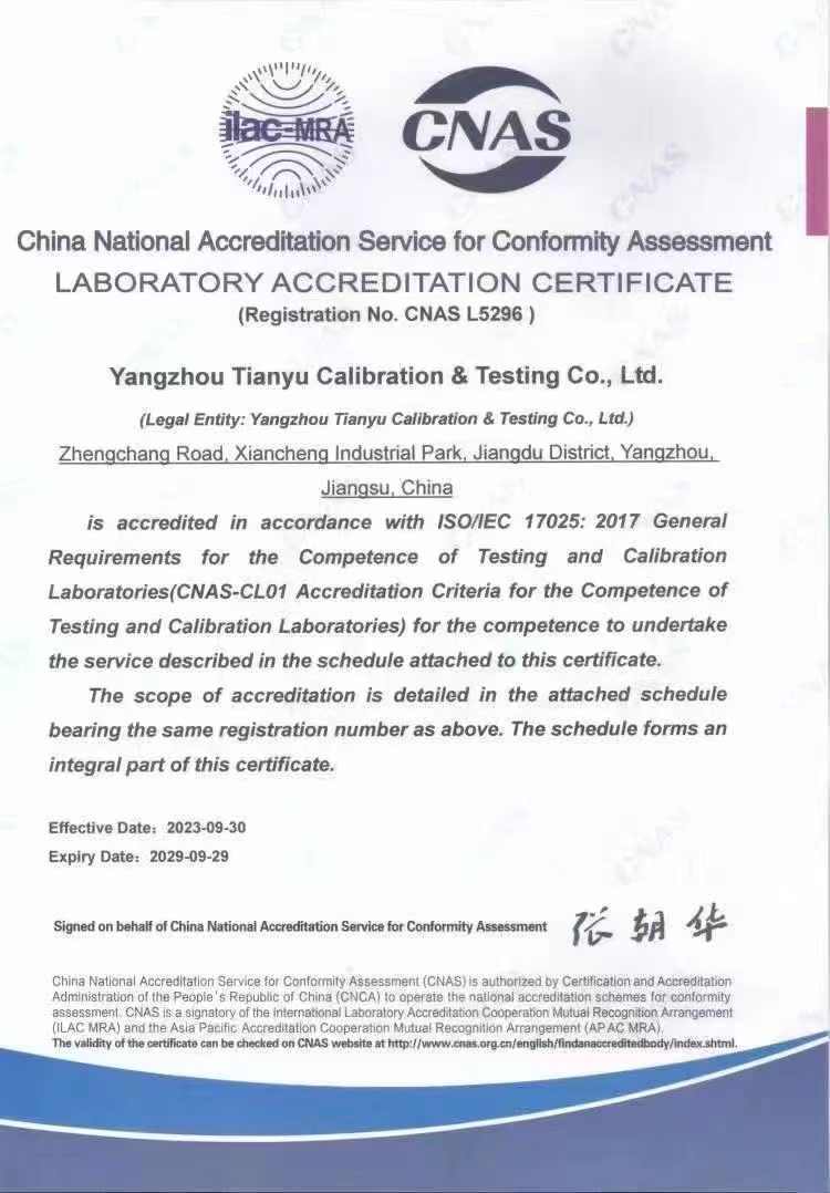 揚州市天域計量測試有限公司,坐落在交通便利的揚州市江都區仙城工業園,成立于2010年10月,2011年11月正式獲取中國合格評定國家認可委員會認可(授權),注冊號:CNAS L5296。近幾年的發展,實驗室已具備了較大規模,并形成了集計量器具檢測,計量技術咨詢和計量器具銷售為一體的專業化技術機構,客戶覆蓋蘇南、蘇北、和浙江,安徽部分地區,客戶群總量達到了上千家企事業單位。實驗室建立健全了一套較為完整的內外部質量管理體系,至今未發生糾紛和客戶投訴事件。